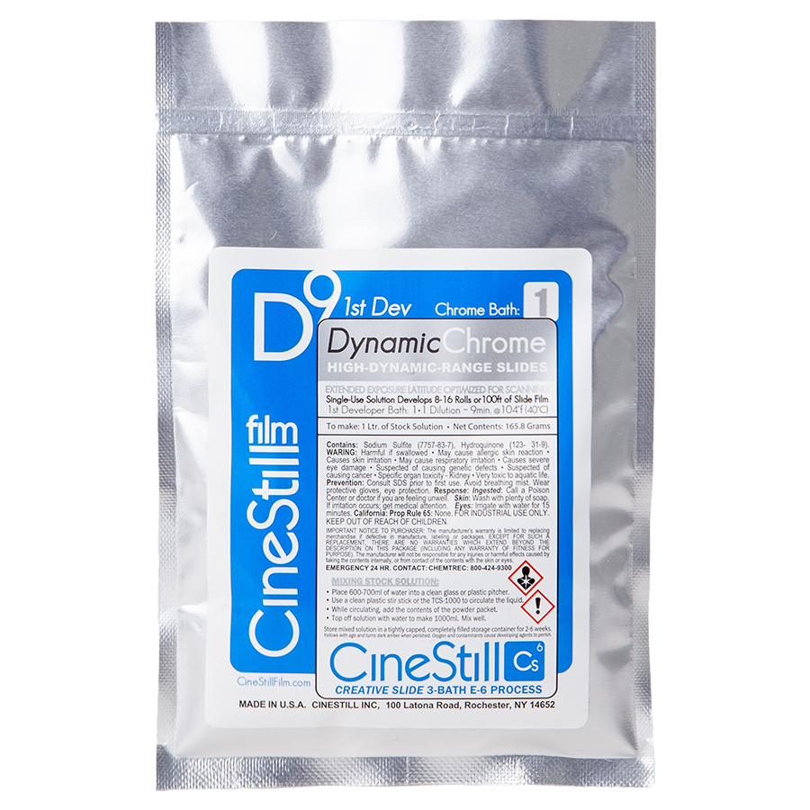 D9 "DynamicChrome" is the world’s most flexible 1st developer for slide film, rendering approximately 9+ stops of usable dynamic range, compared to approximately 6 stops with conventional E-6 processing (or D6 "DaylightChrome 1st Developer) while maintaining vibrant color-contrast and rich warm-tones with preserved highlight and shadow detail (optimized for scanning) for a more cinematic look. The photographer has the choice between 3 dilutions; dilute 1+1 with water for warm-tone slides with 2+ stops of extended dynamic range, or for further preserved highlight detail and a more neutral color balance dilute 1+2 or 1+3. D9 is perfect for high contrast scenes and is optimized for scanning. 1000ml stock solution makes 2000ml of single-use working solution (1+1 Dilution) to develop up to 16 rolls or 100ft of slide film