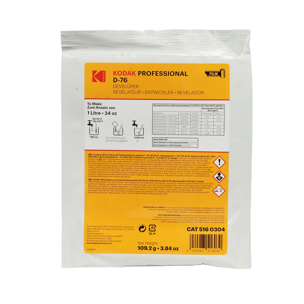 Kodak Professional D-76 er en klassisk svart-hvitt filmfremkaller som gir fine kornresultater sammen med full filmhastighet, høy detaljrikdom i skygger og normal kontrast. Denne pulverfremkalleren inneholder nok kjemikalier til å lage 1 gallon (ca. 3,8 liter) av arbeidsløsning, som kan brukes ufortynnet eller fortynnet 1:1 for økt skarphet med litt mer korn. Fremkallerens evne til å produsere en lang tonal skala med lav sløring er også fordelaktig for push-prosessering.